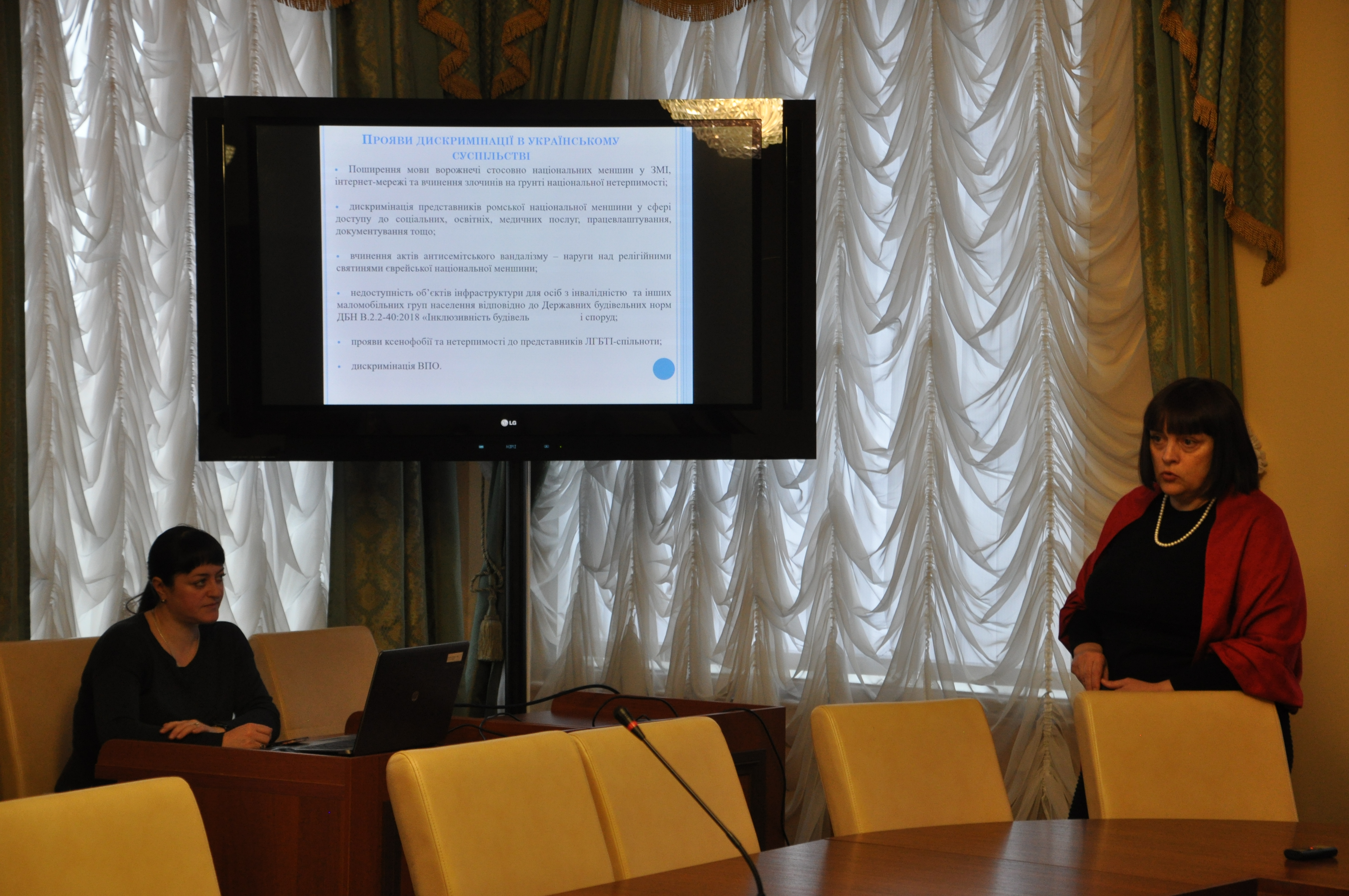 Олена Коваленко розповіла присутнім про тлумачення поняття дискримінації, її основні форми та акцентувала увагу на обов’язковому дотриманні державними службовцями та працівниками органів місцевого самоврядування законодавчих та нормативно-правових документів, що регулюють дане питання.